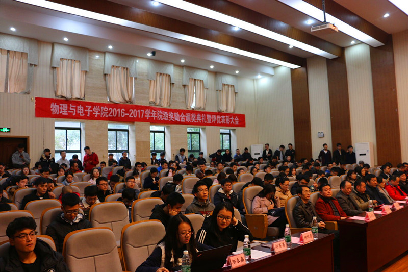 11月22日下午,物理与电子学院2017年院级奖励金颁奖典礼暨评优表彰大会在新校区物理楼116召开。联民药业董事长颜联民,顺康药业董事长赵品高、肖巧芬夫妇,院党委书记许宏武,副院长李长庚、孙克辉、邓宏贵、徐富新,全体辅导员,获奖学生及各班学生代表参加大会,会议由学工办副主任钟旭东主持。