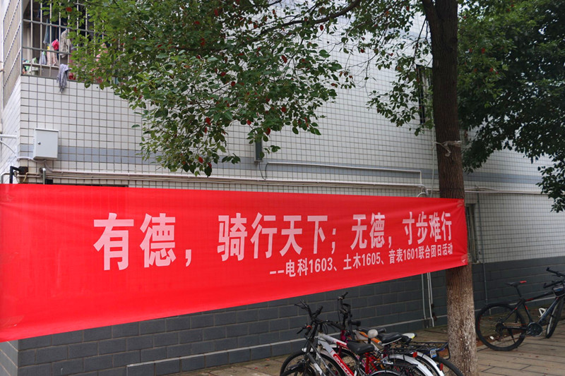 第三部分是文明用车的宣传与实践行动。电科1603班的同学们设计出精美的横幅和海报,向全校同学们宣传文明骑行是一种美德的理念。11月22日下午,全班同学又齐聚中南大学新校区A座门前,以身作则,协助自行车管理队管理自行车。平日里,骑共享单车上学的同学们由于时间紧迫,自行车随意摆放的现象已经司空见惯,被堵得水泄不通的学校大门令进校的同学们十分头痛。电科1603班的同学们不畏辛劳,将被随意停放的共享单车彻底规整,为上下学的同学们开辟出一条通畅的道路。