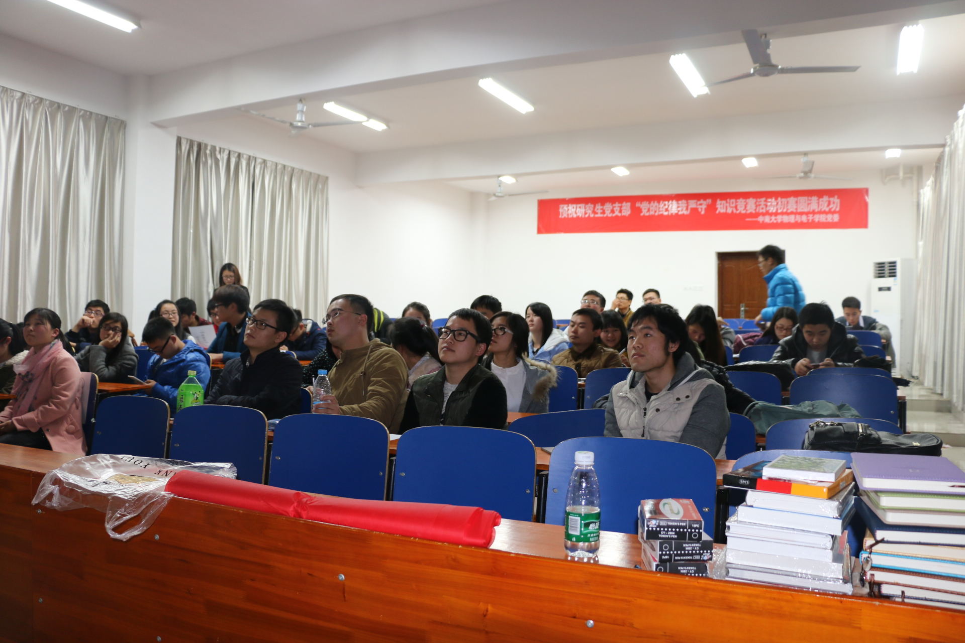 11月29日下午14时30分,物理与电子学院本科生三支部和研究生三支部联合举办的“与时俱进·爱党守纪”知识竞赛活动在物理楼124教室拉开帷幕。研究生党支部书记胡菁菁,本科生三支部书记邬永嘉和支部全体成员参与了此次活动。