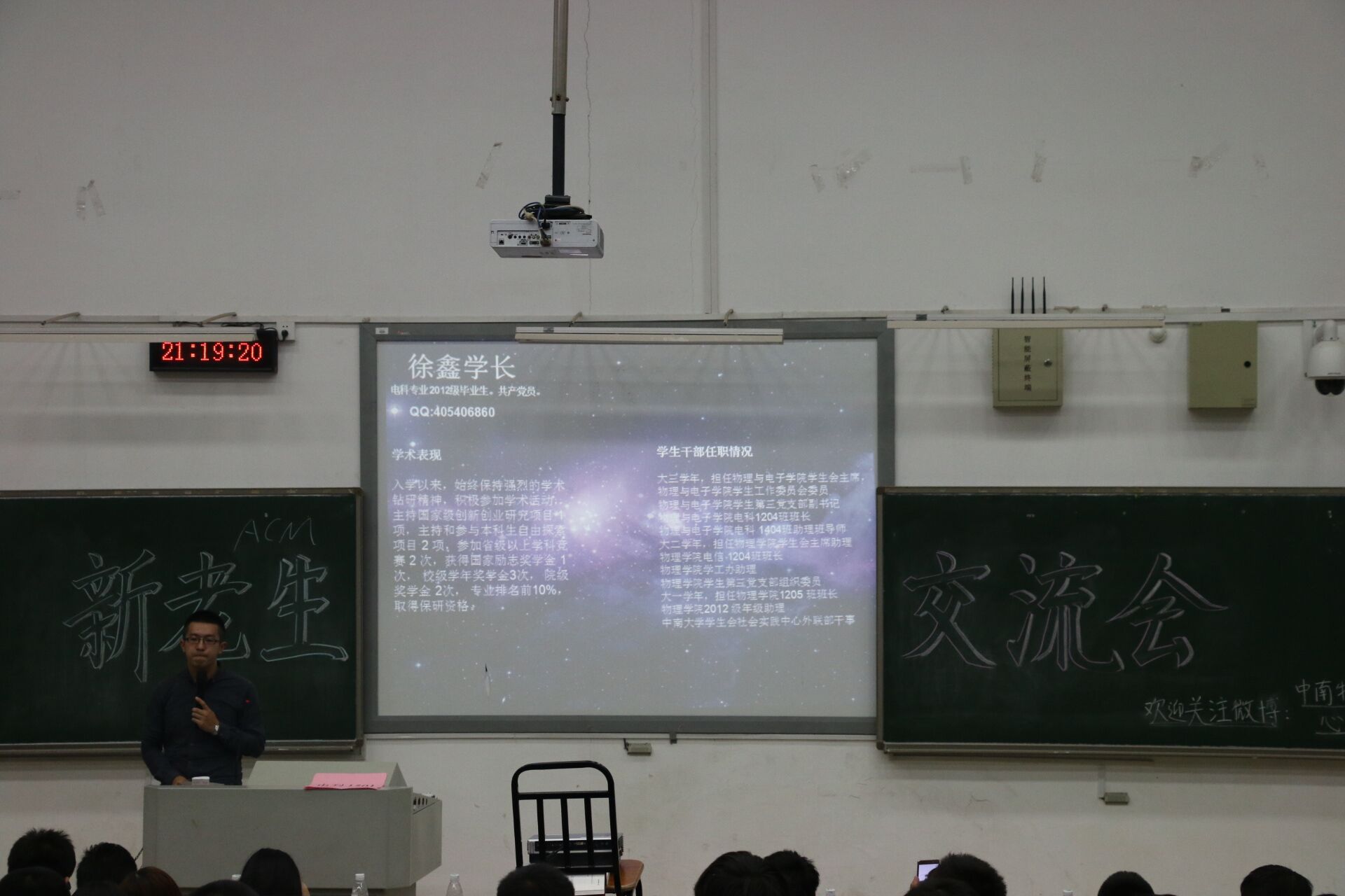 在热烈的掌声与欢呼中,学长学姐们进行了精彩的自我介绍以及经验分享。针对新生们普遍存在的一些问题,他们结合富有特色的PPT,从学习生活、人际交往、目标与爱好等方面为新生们答疑解惑。除此之外,他们还详细介绍了物理院的一些竞赛情况,如电子设计竞赛,嵌入式电路设计比赛等。肖佳珣便是分享了自己电子设计竞赛的经历与经验。她表示,大家要学会坚持,只要肯付出,总会有生生不息的希望和意想不到的惊喜。最后,徐鑫学长从学生工作、职业规划等方面做了总结,并祝愿新生度过一个值得骄傲的大学。学长学姐们惟妙惟肖的话语赢得了同学们的阵阵掌声。在随后的自由提问环节中,新生们提出了自己疑惑和有兴趣的地方,学长学姐们都进行了耐心解答,讨论气氛十分热烈。