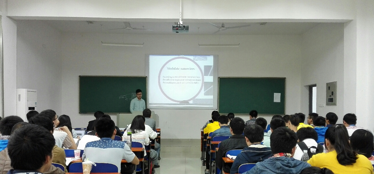 讲评正式开始前,主持人首先介绍了参与评选的教授专家,随后我院参加评选的17个项目的负责人从项目背景、目前相关领域的研究、自己创新之处以及探索的结果等方面做了详细的介绍,并回答了在场同学的问题,教授们也很有针对性的指出了每个项目的优缺点和改进之处。例如,周宇同学做完“银纳米线光色散与衍射行为的电磁学仿真及薄膜透光机制探讨”的报告后,教授首先肯定了项目组的实验能力和团队协作精神,同时也指出了在报告中解释说明环节的不足。